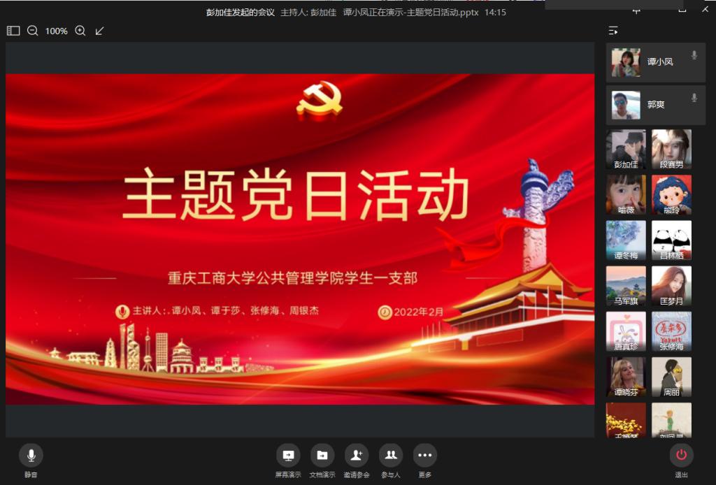当前位置: 首页 >> 党建双创 >> 主题党日活动 >> 正文 beat365中文官网学生一支部2022年2月主题党日活动顺利召开 时间:2022年02月21日 09:32 作者: 郭爽 2022年2月18日15时,beat365中文官网学生一支部在企业微信召开2月主题党日活动。学生一支部全体党员同志均准时参会。会议还邀请了教工一支部马军旗老师和部分发展对象及积极分子参加。 本次主题党日活动由谭小凤、谭于莎、周银杰、张修海同志领学2月组织生活会的相关文件。其中,谭小凤同志领学了《学习贯彻党的十九届六中全会精神专题研讨班开班式上的重要讲话精神》、《习近平在十九届中央纪委六次全会上的重要讲话精神》、《习近平:不断做强做优做大我国数字经济》;谭于莎同志领学了《习近平在2022年世界经济论坛视频会议的演讲(全文)》、《习近平在十九届中共中央政治局第三十六次集体学习会议上的讲话精神》、《习近平在中国同中亚五国建交30周年视频峰会上的讲话(全文)》;周银杰同志领学了《中国共产党第十九届中央纪律检查委员会第六次全体会议公报》、《1月24日中共中央政治局会议精神》、《2022年全国教育工作会议精神》;张修海同志领学了《全市党史学习教育总结会议精神》、《中国共产党重庆市第五届纪律检查委员会第六次全体会议决议》、《市委常委会传达学习贯彻习近平总书记在十九届中央纪委六次全会上的重要讲话精神》、《陈敏尔:坚定信心、凝聚共识、勇毅前行、为推动高质量发展贡献智慧力量》等内容。 领学结束后大家进行了激烈的讨论。其中,王箫琴同志说到:“当前我国处于高速发展的阶段,其中大数据,云技术越发重要,关注数字经济的发展,推动数字经济的发展尤为重要。”任瑶同志说到自己的看法:“今年是我国进入全面建设社会主义现代化国家,向第二个百年奋斗目标进军的重要一年,在这样特殊的一年里,作为青年大学生,增强“四个意识”、坚定“四个自信”、做到“两个维护”是对我们基本的要求。” 最后支部书记郭爽同志总结发言:“第一,对于党史的学习,不管是党员、预备党员、发展对象还是入党积极分子有应该每天保持学习,不断提高自己的理论储备,提高理论修养;第二,在即将开学之际,大家要按照学校的要求进行防疫,做好返校准备,不去中高风险地区,及时上报行程,做好核酸,及时返校。” 上一条:beat365中文官网学生一支部2021年度基层党组织组织生活会和民主评议顺利召开 下一条:beat365中文官网学生一支部2022年1月主题党日活动顺利召开 【关闭】