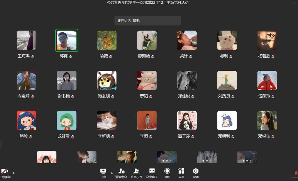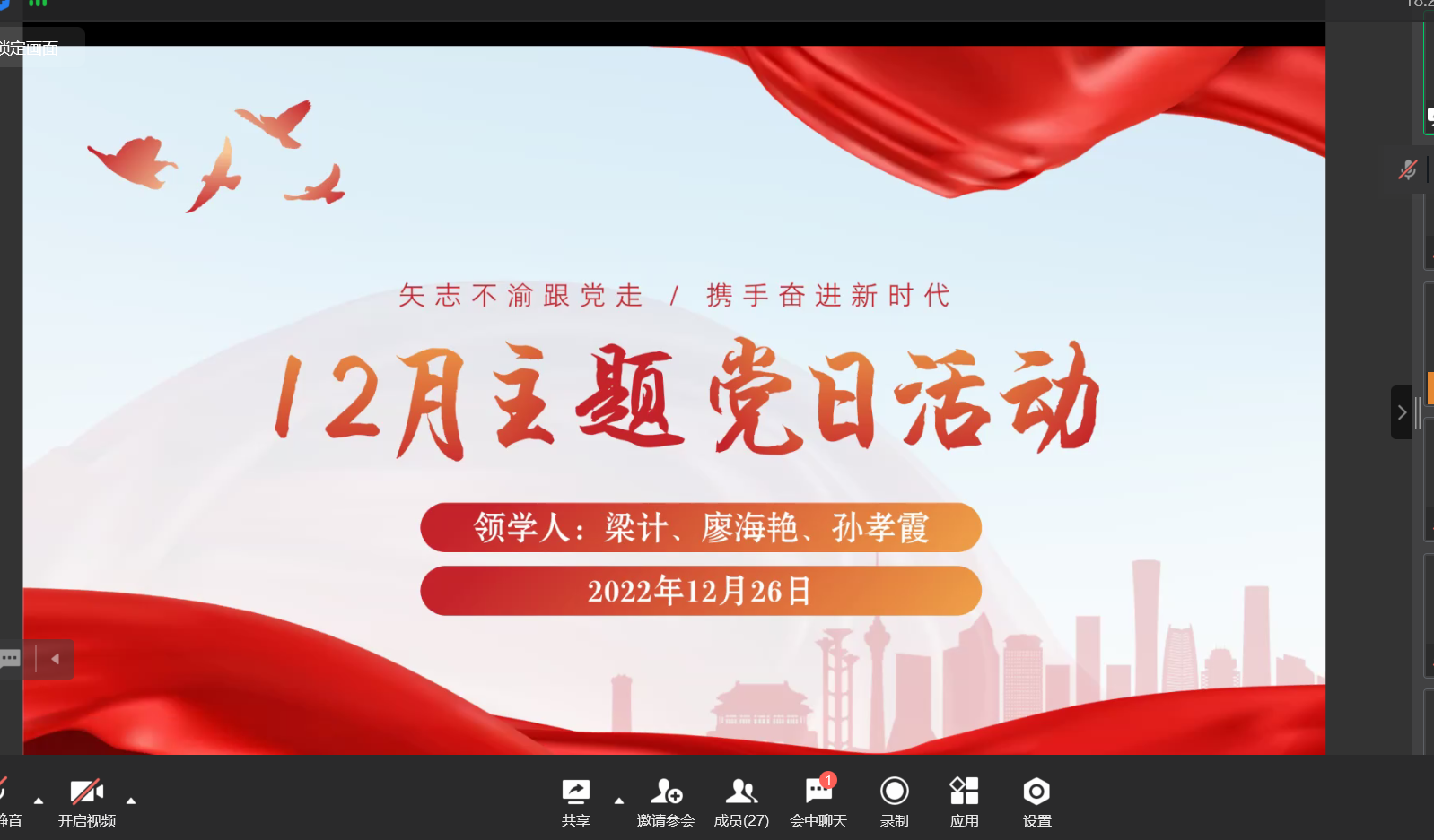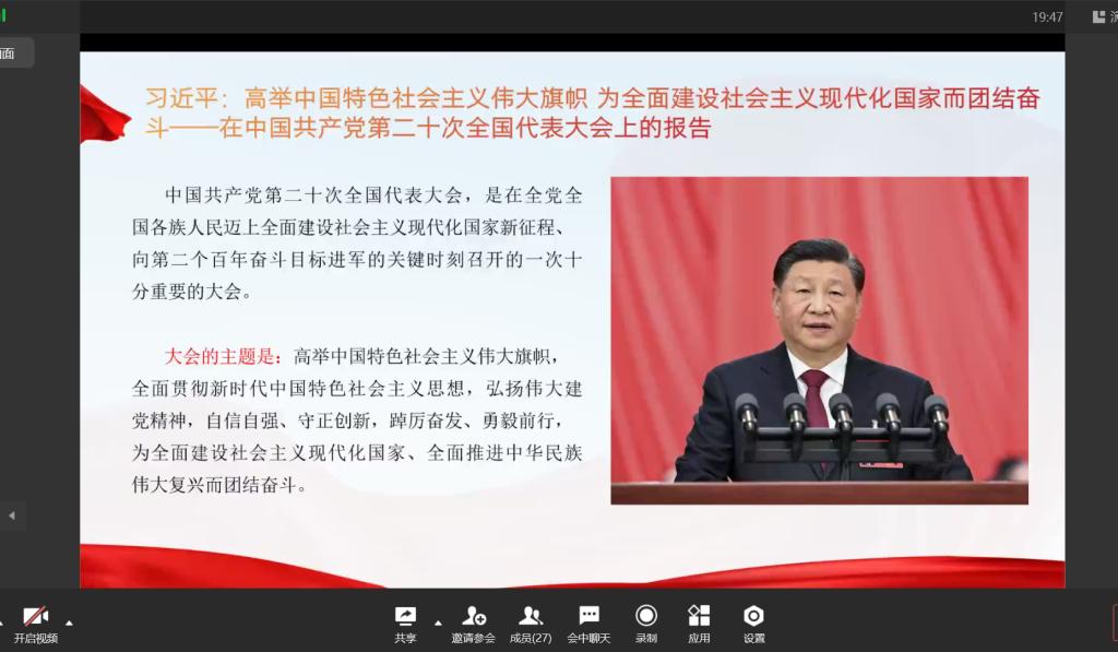 当前位置: 首页 >> 党建双创 >> 主题党日活动 >> 正文 beat365中文官网学生第一党支部召开2022年12月主题党日活动 时间:2022年12月26日 17:23 作者: 郭爽 2022年12月26日,beat365中文官网学生第一党支部在企业微信召开2022年12月主题党日活动,本次活动应到27人,实到27人,本次会议由支部书记郭爽同志主持。 会议伊始,首先是由2020级梁计、廖海艳、孙孝霞三位党员同志领学12月相关学习内容。其中,梁计同志领学了《习近平:高举中国特色社会主义伟大旗帜 为全面建设社会主义现代化国家而团结奋斗——在中国共产党第二十次全国代表大会上的报告》、《中国共产党第二十次全国代表大会关于十九届中央委员会报告的决议》、《中国共产党章程(中国共产党第二十次全国代表大会部分修改,2022 年 10 月 22 日通过)》、《中国共产党第二十次全国代表大会关于《中国共产党章程(修正案)》的决议》的内容,廖海艳同志领学了《十九届中央纪律检查委员会向中国共产党第二十次全国 代表大会的工作报告》、《中国共产党第二十次全国代表大会关于十九届中央纪律 检查委员会工作报告的决议》、《习近平在第五届中国国际进口博览会开幕式上的致辞》、《习近平在《湿地公约》第十四届缔约方大会开幕式上的致辞》的内容,孙孝霞同志领学了《中共中央政治局常务委员会 11 月 10 日会议精神》、《习近平在二十国集团领导人第十七次峰会第一阶段会议上的讲话》、《习近平在党的十九届七中全会第二次全体会议上的讲话》的内容。领学完毕后,与会党员同志展开了讨论。晏利同志说我们要坚持以习近平同志为核心的党中央的领导,高举中国特色社会主义伟大旗帜,弘扬伟大建党精神,增强“四个意识”坚定“四个自信”做到“两个维护”。熊玲同志说我们的党员、干部,不论在职还是从工作岗位上退下来了,无论在什么时候、什么地方、什么场合,都要始终牢记自己是一名共产党员,都要始终发挥先锋模范作用,都要始终坚持和维护党的领导、维护党的团结统一。 讨论后,支部书记郭爽同志作了讲话。首先,他向在座的党员同志讲述了江泽民同志伟大光辉的一生,我们缅怀江泽民同志,就是要牢记他的殷切希望,要在以习近平同志为核心的党中央坚强领导下,踔厉奋发、勇毅前行,以更辉煌的业绩告慰江泽民同志。其次,他也提醒大四的党员同志要利用好寒假时间努力寻找工作,并且着手毕业论文的事情,在不断学习中提升自己。 上一条:beat365中文官网学生第一党支开展2023年1月份主题党日活动 下一条:【学习党的二十大精神】“学习党的二十大精神,立志做新时代好青年”知识竞赛圆满结束 【关闭】