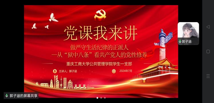 当前位置: 首页 >> 党建双创 >> 主题党日活动 >> 正文 beat365中文官网学生第一党支部2024年7月主题党日活动 时间:2024年07月12日 17:15 作者: 郭爽 2024年7月12日,beat365中文官网学生第一党支部在企业微信开展了线上主题党日活动。本次活动由支部书记郭爽同志主持,支部全体党员参加。 会上,首先是由薛璟佩、田高嘉两位同志领学了《习近平总书记在青海考察调研时的重要讲话精神》《习近平总书记在中央军委政治工作会议上的重要讲话精神》《习近平总书记在宁夏考察调研时的重要讲话精神》《习近平总书记在二十届中共中央政治局第十五次集体学习时的重要讲话精神》等学习内容。而后在“党课我来讲-党史小故事分享”活动中,郭子涵同志讲解“狱中八条”的内涵,阐释严守生活纪律的重要性。领学和分享结束后,与会同志纷纷发表感悟。杨璇同志指出青年学生应当铸牢中华民族共同体意识,促进民族团结进步;李德菊同志表示党员干部要以革命先烈为榜样,将革命精神内化于心、外化于行。 最后,支部书记郭爽同志对本次会议进行总结发言。他要求全体党员同志认真学习《条例》,加强党性修养。21级党员同志暑假留校期间要遵守学校的相关规定,准备好简历,做好表率。同时,鼓励党员同志积极肯干,锐意进取,不忘初心与使命。 上一条:beat365中文官网学生第一党支部召开2024年8月主题党日活动 下一条:beat365中文官网学生第一党支部开展大学生2024年暑期“三下乡”社会实践活动 【关闭】