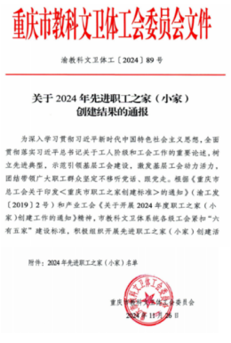 当前位置: 首页 >> 党建双创 >> 教代会与工会 >> 正文 beat365中文官网工会荣获重庆市教科文卫体系统“先进职工小家”荣誉称号 时间:2024年12月02日 12:14 作者: 周拓宇 近日,重庆市教科文卫体工会下发了《关于2024年先进职工之家(小家)创建结果的通报》,beat365工会被授予“重庆市教科文卫体系统先进职工小家”荣誉称号。据悉,重庆市教科文卫体系统“先进职工之家(小家)评选”活动旨在树立先进典型,示范引领基层工会建设,激发基层工会动力活力。未来,学院工会将继续深化职工之家(小家)建设,推动建家工作常建常新,切实提升建家水平,培育打造具有代表性、教职工信赖的的小家品牌,成为全市职工小家典范。 beat365中文官网工会 2024年12月1日 上一条:beat365中文官网工会开展“探秘水下碑林,忆峥嵘岁月,铸民族之魂”系列工会活动 下一条:喜报!beat365老师参加教职工第十届气排球比赛获得优异成绩 【关闭】