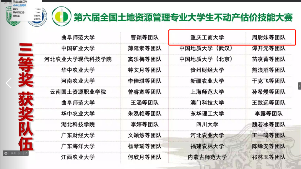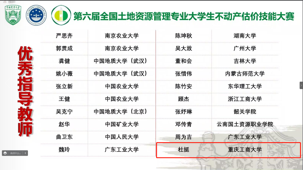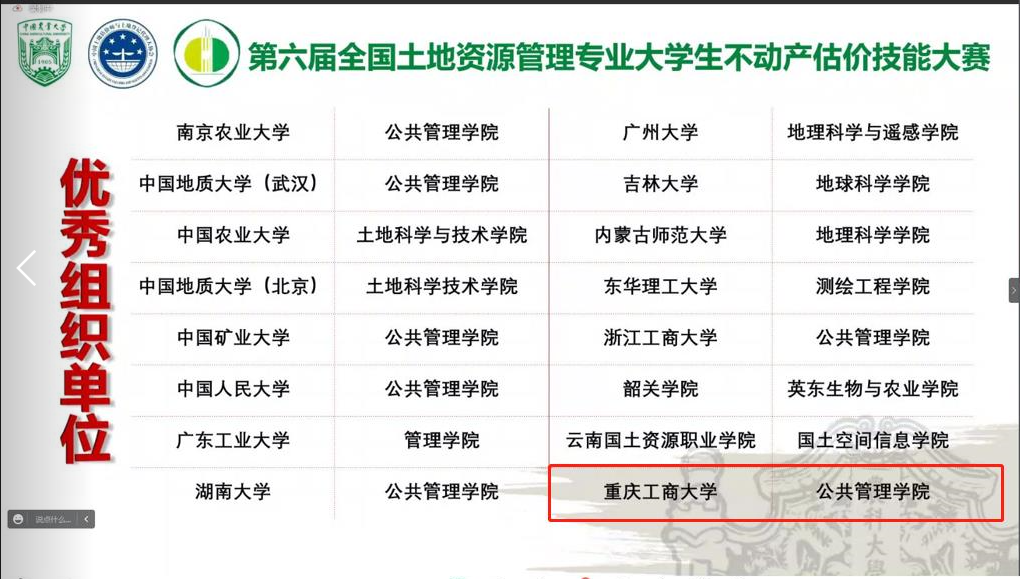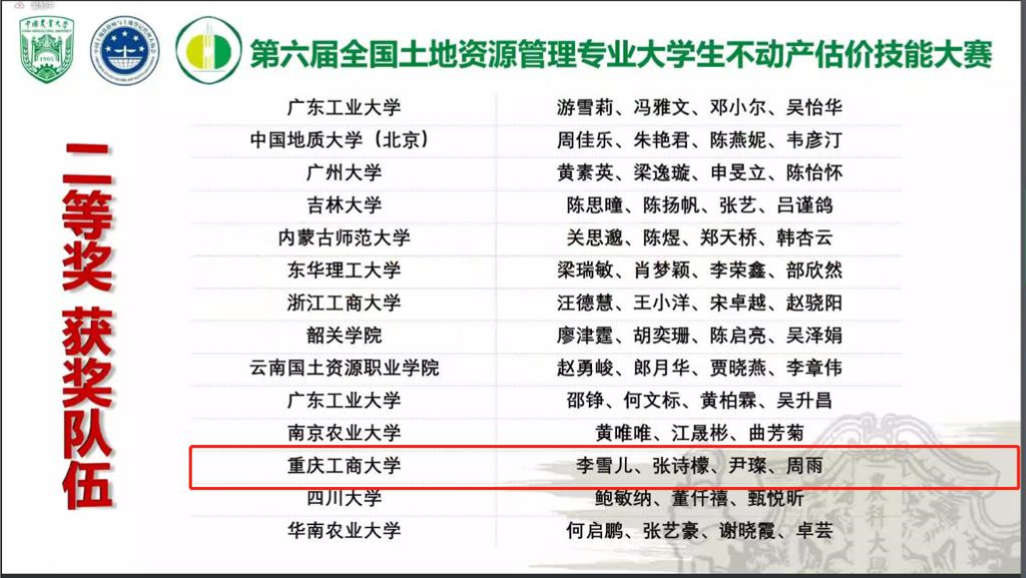 当前位置: 首页 >> 正文 喜报!beat365学子在第六届全国大学生不动产估价技能大赛中斩获佳绩 时间:2022年09月19日 16:12 作者: 杜挺 2022年9月18日,第六届全国大学生不动产估价技能大赛决赛在中国农业大学举行。beat365土地资源管理系派出的两支参赛队伍在本次大赛中斩获多个奖项。由肖轶老师指导,本科生周尉妹、唐新颖、王仕菲、王子贤组队参赛作品《重庆市南岸区风临口袋公园土地开发权价值评估》荣获大赛“三等奖”。由杜挺老师指导,本科生李雪儿、张诗檬、尹璨、周雨组队参赛作品《重庆市巴南区鱼洞街道百胜村11组17号农村集体仓储用地开发权价值评估》荣获大赛“二等奖”。杜挺老师荣获大赛“优秀指导教师”。在全院师生共同努力下,beat365荣获大赛“优秀组织单位”。 全国大学生不动产估价技能大赛由教育部高等学校公共管理类专业教学指导委员会、全国高校土地资源管理院长(系主任)联席会主办,是全国高校土地资源管理专业的品牌赛事之一。本次大赛以“探索与创新:面向未来的不动产估价”为主题,旨在培养和提升大学生的估价实践技能与实践创新能力。今年beat365派出的两支队伍,经作品初筛、专家外审、线上评审、汇报答辩等环境,最终从全国65所高校的110支参赛队伍中脱颖而出。 此次比赛的筹备工作得到了学院领导的关注与支持,参赛同学和指导老师们努力推进项目研究进展,深入乡镇、街道开展实地调研,反复打磨和完善项目材料,组织了多轮答辩演练。最终,参赛项目在决赛中斩获佳绩! 据悉,经大赛组委会批准,明年将由beat365承办第七届全国大学生不动产估价技能大赛。在今年大赛闭幕式上,李孜院长受邀代表明年承办方进行发言。 上一条:第四届“Social Eyes”社会调查大赛决赛顺利举行 下一条:欢迎报考beat365中文官网 【关闭】
