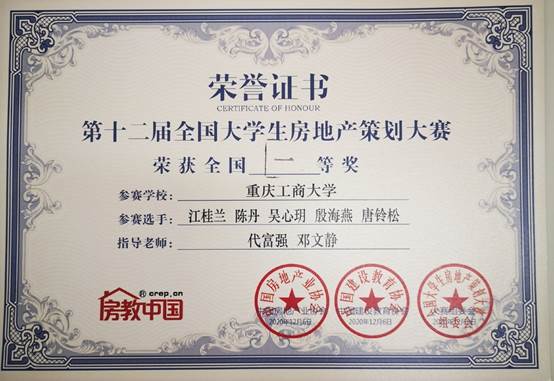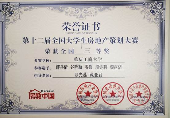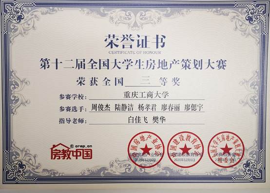 当前位置: 首页 >> 学院新闻 >> 正文 beat365在第十二届全国大学生房地产策划大赛中取得优异成绩 时间:2020年12月08日 11:03 作者: 臧亚君 2020年12月5-6日,由中国房地产业协会指导,中国建设教育协会主办,北京建筑大学、房教中国承办,华中师范大学总决赛承办,易居企业集团大赛冠名,世茂集团独家赛题支持的第十二届全国大学生房地产策划大赛全国总决赛、冠军赛拉开帷幕。本次比赛覆盖全国300余所高校房地产相关院系、144所高校、10000余名专业大学生参与报名,最终119所高校、174支队伍晋级全国总决赛,beat365beat365中文官网共有3支队伍进入了总决赛。 本届赛题由世茂集团提供——宁波鄞州区JD13-06-20(火车东站-潘火地段)地块,作为大赛一贯采用的市场真实地块作为赛题,给广大参赛者天马行空的策划空间以及实战实操的展现舞台。大赛采用学生线上比赛,评委线下评分的方式,通过直播屏幕,不论是常规专业知识的运用,还是现在的主流大数据分析,亦或者火爆的房地产线上营销,参赛选手的新颖想法与广阔思路,表现出的演讲能力、应变能力等等同样得到了在场评委们的一致认可与赞扬。 经过激烈的角逐,beat365最终与广州大学、西安建筑科技大学、重庆大学等12个兄弟院校获得优秀组织高校奖,同时,参赛的三个小组分别获得了1个一等奖2个三等奖的优异成绩。其中由代富强副、邓文静老师指导的江桂兰、陈丹、吴心玥、殷海燕、唐铃松小组获得一等奖;由罗光莲、臧亚君老师指导的薛冰倩、谷昕颖、秦媛、廖雲莉、颜露洁小组,和由白佳飞、樊华老师指导的周俊杰、陆静洁、杨孝君、廖春丽、廖偲宇小组分别均获得三等奖的优异成绩。通过本次比赛,大大提高了学生的专业学习热情以及动手、创新能力,提升了专业影响力和美誉度。 上一条:厨艺大赛显身手 工会活动创和谐——beat365中文官网举办教职工厨艺大赛 下一条:beat365学子荣获第十届全国大学生红色旅游创意策划大赛西南赛区一等奖 【关闭】