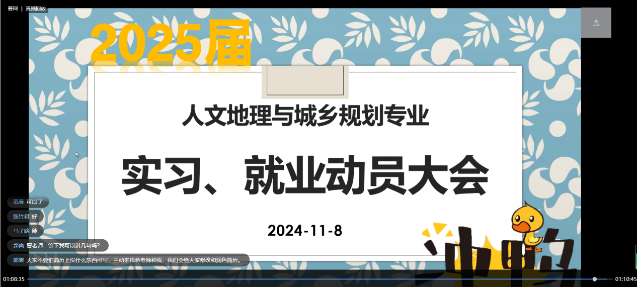 当前位置: 首页 >> 学院新闻 >> 正文 "启航未来,就业动员" 人文地理与城乡规划专业举办毕业生实习、就业动员大会 时间:2024年11月09日 15:30 作者: 曹珂 近日,为了有效推进人文地理与城乡规划专业2025届毕业生的实习与就业工作,提升毕业生的实践能力和就业竞争力,城乡规划系于2024年11月8日召开线上毕业生实习、就业动员大会。会议邀请了城乡规划系全体教师、就业联络员郭爽老师、辅导员蒋杰老师和2025届人文地理与城乡规划专业全体学生参加,旨在通过集体动员和讨论,激发学生的实习热情,推进学生尽早签订就业协议。 会议首先强调了实习在城乡规划专业人才培养中的重要作用,应届毕业生的第一次就业对于人生来说的重要意义。系主任曹珂老师从不忘初心,努力奋斗;认清形势,把握机遇;转变观念,勇于尝试;珍惜机会,积极行动;坚强后盾,全力支持五个方面分别对学生实习、就业工作进行了阐述,建议同学们根据自身情况做出选择,将个人的发展与国家的命运紧密结合起来,把握就业机会、积极行动起来,同时还表达全系教师、辅导员将会全力支持,为学生提供的就业指导与支持服务。 李斌教授从当前行业发展趋势、人才需求变化以及就业竞争态势等对人文地理与城乡规划专业的就业形势进行了详细分析。强调了现阶段时间的紧迫性、就业协议签订的重要性,鼓励学生先就业再择业,尽早签订就业协议,为自己的未来职业发展打下坚实的基础。 郭爽老师介绍了近期学校即将开展的大型招聘会议,从简历制作指导、面试技巧培训等方面对学生提出建议。同时,鼓励学生积极参与校内外就业招聘活动,主动与用人单位建立联系,在就业过程中不断锻炼、提升自己的个人能力。 蒋杰老师对本专业学生目前考研、考公、就业的人数比例进行了介绍,希望学生们能够积极参与实习活动,为自己的就业之路打下坚实的基础。 实习与就业是人文地理与城乡规划人才培养的重要环节。会议决定,将进一步加强与企业和用人单位的合作,拓宽实习和就业渠道;同时,加强就业指导与支持服务,帮助学生明确就业方向和目标,提升就业竞争力。希望2025届全体毕业生能够积极参与实习活动,尽早签订就业协议,为自己的未来职业发展赢得更多的机会和时间。 上一条:广东医科大学MPA教育中心陈小嫦教授一行来beat365开展座谈交流 下一条:beat365医保治理能力现代化研究院成功协办第二届重庆“两江医保论坛” 【关闭】