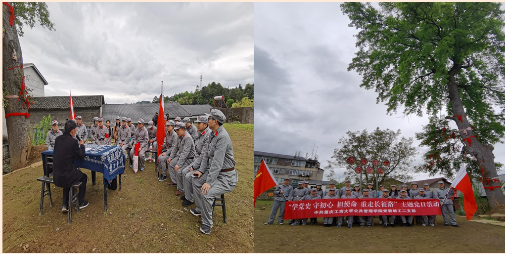 当前位置: 首页 >> 党建双创 >> 正文 beat365中文官网教工党支部赴綦江区安稳镇开展“学党史、守初心、担使命,重走长征路”主题党日活动 时间:2021年04月13日 10:11 作者: 文/蔡进 陈向军 图/蔡 进 党史学习教育怎么学,学什么?如何推进党史学习教育内容、形式、方法的创新,不断增强针对性和实效性?如何更好地为师生办实事解难题,服务师生,服务社会?beat365中文官网党委以党建为引领,结合学院专业学科特色与专长,创新“党建+”新模式,走出党建工作新路子。 beat365中文官网党委与重庆市綦江区安稳镇党委在2021年1月达成为“党建+”为主题的校地合作新模式。2021年4月10日,在学院党委书记张维贵的带领下,beat365中文官网教工支部党员赴重庆市綦江区安稳镇,与安稳镇政府共签“党建服务乡村振兴实践基地”合作协议,以党建联盟为纽带,共同构建互利互惠的局面。 基于此,在签约仪式后,beat365中文官网教工党员队伍到安稳镇羊角村、崇河村开展了“学党史 守初心 担使命 重走长征路”主题党日活动。 第一站,到达了安稳镇羊角村,开展“枫香树下学党史活动”,在这里聆听了当地老党员同志陈光和讲述中央红军过綦江以及邓华将军驻扎枫香树的故事。在此了解到中央红军过綦江,造成佯攻重庆之势,确保了遵义会议顺利召开,实现了战略转移意图。 图1 枫香树下学党史 第二站,到达了羊角村学校,参观了抗美援朝蒋朝二烈士碑,由羊角村学校四年级小学生志愿者张雅涵为大家讲解了蒋朝二烈士的英勇故事。 图2 参观蒋朝二烈士碑 第三站,在大垭口重走长征路,亲身体会当年红军走过的长征路,道路泞泥难走,党员同志们却精神抖擞,高唱着《团结就是力量》和《没有共产党就没有新中国》等革命歌曲,去感受80多年前红军们留下的革命足迹。 图3 重走长征路 第四站,来到了崇河红军街。这里是当地政府打造的具有浓厚红色革命氛围和文化的一条800米左右的街道,街道两边革命标语、红色革命素材随处可见,仿佛又回到了革命年代。最后在学院党委张维贵书记的带领下,在红军街长征广场重温了入党誓词。 图4 重温入党誓词 足迹殷殷,筚路蓝缕,重走长征路,大家呼吸了80多年前的空气,感受了80多年前的风雨,聆听了80多年前的故事;重走长征路,党员同志们缅怀先烈,领悟了革命、建设与改革的重大意义,并从中学习并传承革命先烈的红色精神,更好地感悟了信仰之力、理想之光、使命之艰、担当之要,更好汲取开拓前进的强大勇气、智慧和力量,真正做到了学有所思、学有所悟、学有所得。在后继与安稳镇结对共建中,beat365中文官网将协助地方深入挖掘与规划“党建+长征文化”,把红色资源利用好、把红色基因传承好、把红色传统发扬好。 上一条:beat365中文官网教工第二党支部党员老师带领学生服务乡村振兴 下一条:beat365中文官网学生党支部开展“庆党建,学党史”暨党史知识竞赛活动 【关闭】