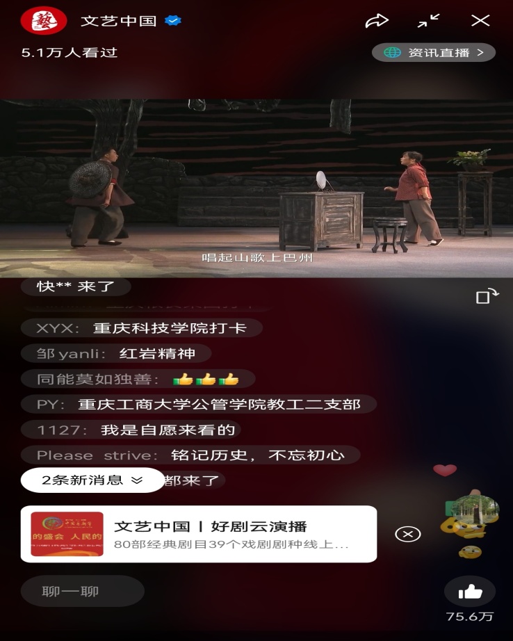 当前位置: 首页 >> 党建双创 >> 正文 beat365中文官网党委组织所属各支部观看川剧《江姐》线上直播 时间:2022年09月13日 16:20 作者: c 根据校党委宣传部的统一学习安排,beat365党委组织所属各支部通过“文艺中国”视频号在线观看了川剧《江姐》。此剧目是我市参加第十三届中国艺术节而报送的参评参演的优秀舞台艺术作品,代表重庆于9月11日演出参评,并在文艺中国等多个平台进行网络直播。 该剧取材于小说《红岩》,重庆作为红岩精神的诞生地、发源地,努力传承、弘扬、践行好红岩精神是基层党组织的责任与义务,通过集中在线观看,党员同志们深刻地体会到江姐等老一辈革命者坚如磐石的理想信念、和衷共济的爱国情怀、艰苦卓绝的凛然斗志、百折不挠的浩然正气,纷纷在留言区发表观看感言。 教工第二党支部书记赵伟同志表示:“二支部作为全国样板支部,我们每位党员同志都要成为红岩精神传承人、接力者,凝心聚力,赓续共产党人精神血脉,为党育人,为国育才,把红岩精神融入践行初心使命的全过程”。 上一条:【党建"双创"】以赛促学,扎实推进学科课程思政建设——beat365中文官网学子在“第十二届全国大学生红色旅游创意策划大赛”中斩获佳绩 下一条:践行两山理论 建设美丽中国——《景观规划设计》课程思政走进乡村 【关闭】