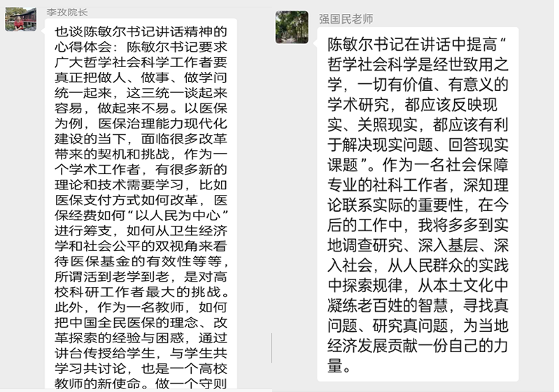 当前位置: 首页 >> 科学研究 >> 正文 beat365中文官网党委组织学院教师学习陈敏尔书记在重庆市社科联第五次代表大会开幕式上的讲话精神 时间:2022年04月27日 10:23 作者: 2022年4月12日,陈敏尔书记在重庆市社会科学界联合会第五次代表大会开幕式上发表讲话。他强调指出,要深入学习贯彻习近平总书记关于哲学社会科学的重要论述,始终牢记初心使命,发扬历史主动精神,高举旗帜凝心聚力,围绕中心服务大局,立足实际守正创新,推动哲学社会科学事业大发展大繁荣,为全市人民奋进新征程、建功新时代提供强大的精神动力、理论支撑和智力支持,以优异成绩迎接党的二十大胜利召开。 4月22日,beat365中文官网党委积极响应,组织全院教师认真学习了陈敏尔书记的讲话,讲话在学院老师中引起热烈反响和讨论,教师们纷纷表示倍感振奋、深受鼓舞。会后,学院科研平台人员开展了线上学习交流,并展开了热烈讨论。他们就“围绕中心、服务大局”“立足实际、守正创新”以及“做大学问、做真学问、做好学问”等内容纷纷撰写心得体会,畅谈学习认识感悟。 山区土地利用监测与规划管理研究中心主任、巴渝青年学者王兆林教授:通过学习陈敏尔在市社会科学界联合会第五次代表大会开幕式上的讲话精神,我们要自觉做习近平新时代中国特色社会主义思想的信仰者、追随者、践行者,不断增强政治认同、思想认同、情感认同,加强理论武装,深化研究阐释,做好宣传普及。平台工作要围绕中心、服务大局,为全市经济社会发展献良计出高招。要紧扣习近平总书记对重庆所作重要讲话和系列重要指示批示精神,坚持以人民为中心的研究导向,树立鲜明问题导向,加强全局性、战略性、前瞻性研究,拿出一批具有思想分量、对策质量、价值含量的研究成果,真正把论文写在重庆大地上,把学问写进群众心坎里。 医保治理能力现代化研究院副主任、青年教师吴香雪博士:陈敏尔书记要求广大哲学社会科学工作者要真正把做人、做事、做学问统一起来,立志做大学问、做真学问、做好学问,在为祖国、为人民立德立言中成就自我、实现价值。我所在的专业社会保障是国家的一项社会基本制度,是国家治理之“重器”,是“以人民为中心”的伟大实践。作为广大的青年社保学者群体的一份子,愿意做理论和政策的桥梁,愿意做研究和现实的桥梁,愿意做学界和决策者的桥梁,坚持问题导向,坚持研究的主体性和原创性,立学为民,治学报国。 人口发展与政策研究中心副主任、青年教师薛晓博士:做科研,需要立足实际,守正创新。作为科研工作者,既要踏踏实实遵循研究对象本身的客观规律,也要敢想、敢验证,去突破一些旧有的思想和意识,大胆突破条条框框的限制。 张欣博士:学习了陈敏尔书记在重庆市社会科学界联合会第五次代表大会开幕式上发表讲话,作为一线的教师,我们应该为“落地”的教学科研作积极准备,进而切实行动起来,将教学科研变成老师们的幸福栖居。以“课”为例,我们首先要课前认真“做课”,给自己一种价值感和期待感;其次,课中从容“上课”,还自己一份获得感和幸福感;再次,课后充分“议课”,给大家一种代入感和归属感;最后,要在科研与教学中挖掘好、保护好、传承好、发展好、创新好、宣传好重庆独特而厚重的历史文化资源,真正把论文写在重庆大地上,把学问写进学生心坎里,发出重庆好声音、展示重庆新形象,有力助推重庆经济社会发展,以优异成绩迎接党的二十大和市第六次党代会胜利召开。 夏涛博士:社会科学研究要牢牢把握正确的政治方向,要始终坚持以习近平新时代中国特色社会主义思想为指引;社会科学研究要立足解决经济社会发展的现实问题,力争为重庆市的发展贡献绵薄之力。 刘晓君博士:学哲学,爱哲学。陈敏尔书记在重庆市社会科学界联合会第五次代表大会开幕式上的讲话另我等备受鼓舞。我们可以看到重庆市在繁荣哲学社会科学上所取得的可喜成果。未来,我们也将继续脚踏实地,为全市经济社会发展建言献策。 谭江蓉博士:学习了陈敏尔书记在重庆市社会科学界联合会第五次代表大会开幕式上的讲话之后,作为高校的一名哲学社会科学工作者,受益良多。以习近平同志为核心的党中央高度重视哲学社会科学发展,明确了加快构建中国特色哲学社会科学的战略任务,开启了我国哲学社会科学繁荣发展的新征程。我们应该认真学习贯彻总书记关于哲学社会科学的重要论述,始终坚持与时代同进步、与实践共发展,做学问出精品,树新风育人才。 何增华博士:在科学研究与教学过程中,要始终坚持实际问题为导向,关注并切实解决重庆实际问题。尤其是在科研工作中,要因地制宜、深入群众,扎根重庆大地实践,努力将社科研究成果转化为现实生产力,真正将论文写在重庆大地上。 通过此次学习,学院教师增强了对哲学社会科学的认识。学院也将在今后的科研实践中,认真贯彻学习陈敏尔书记的讲话精神,努力推进学院科研的高质量发展。 上一条:beat365中文官网召开2023年度秋季学期科研工作专题会 下一条:公共管理大讲堂(迎70周年校庆特别讲座)——双碳治理与国土空间规划创新 【关闭】