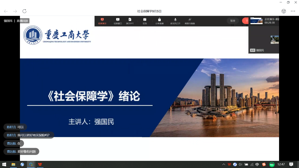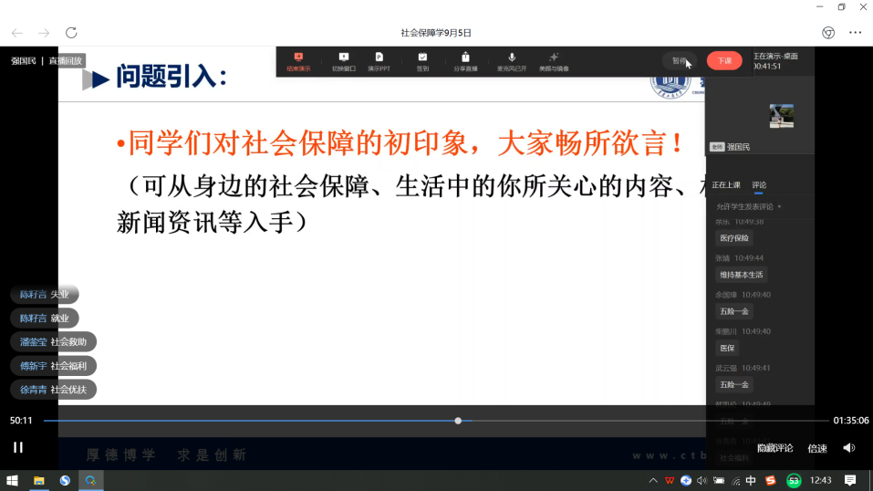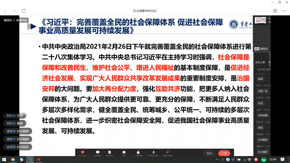 当前位置: 首页 >> 教学动态 >> 正文 《社会保障学》课程线上教学实施情况 时间:2022年09月19日 15:38 作者: 强国民 9月5日上午3-4节,beat365中文官网劳动与社会保障系新进教师强国民通过精心准备,利用企业微信首次线上直播为20财政一、二班93名学生讲授《社会保障学》课程。在直播教学中,强国民老师积极融入课程思政,从同学们对社会保障初印象介入,引导同学们积极参与课堂互动,踊跃发言,关注现实中的社会保障问题,最后落脚到习近平同志对社会保障制度的定位——社会保障是治国安邦的大问题,如此通过理论与实践相结合的方式不断启发同学们去关心、思考并尝试去解决现实中的社会保障问题,在提升教学效果的同时也进一步提升了学生的专业能力和综合素质。 上一条: 高标准 高质量 严要求 下一条:【党建"双创"】以赛促学,扎实推进学科课程思政建设——beat365中文官网学子在“第十二届全国大学生红色旅游创意策划大赛”中斩获佳绩 【关闭】